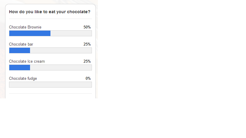 Looks like we have a winner. The chocolate brownie took first place. Next two were tied, chocolate bar and chocolate ice cream. What happen to the chocolate fudge guys?? Lol I will eat chocolate any way!!! Thank you for all of you who voted.