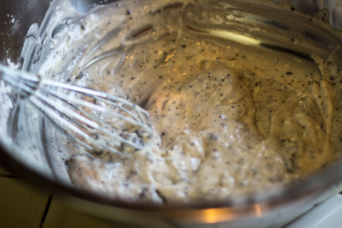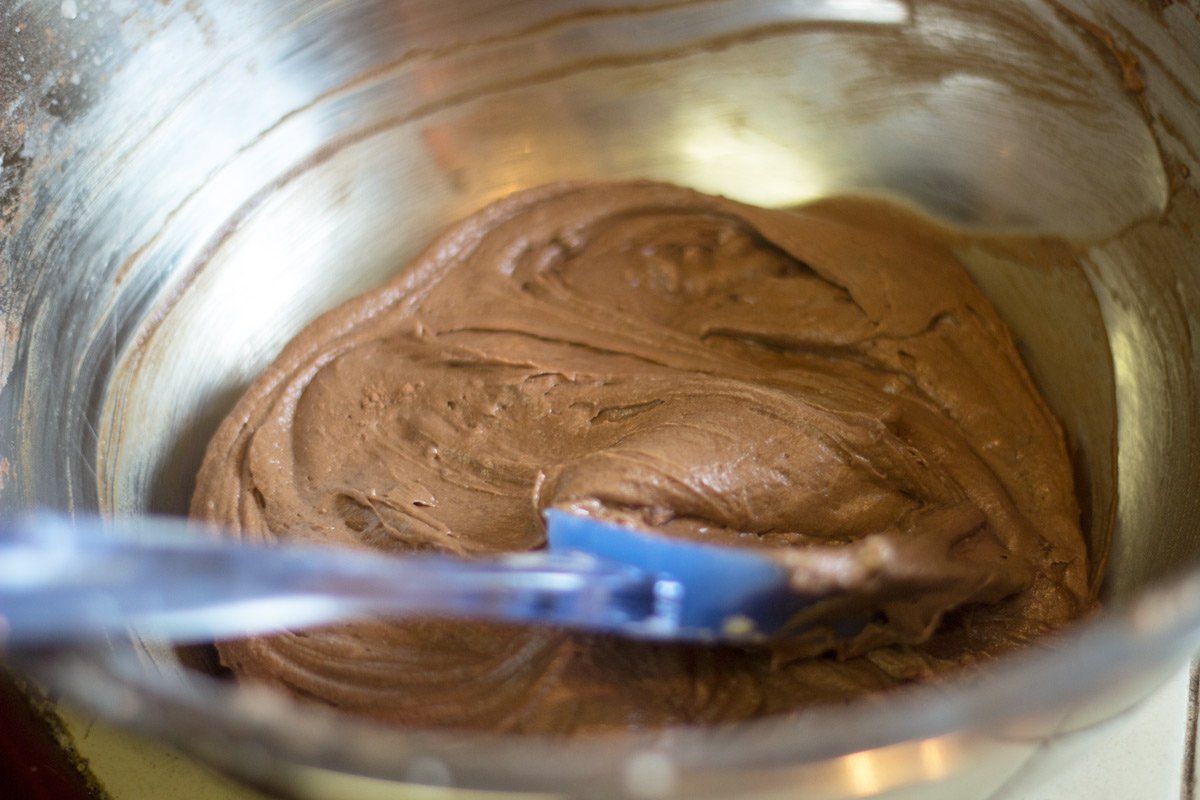 In a large mixing bowl combine all the cake ingredients except the oreos. Combine and mix well. Stir in the crushed oreos and mix.