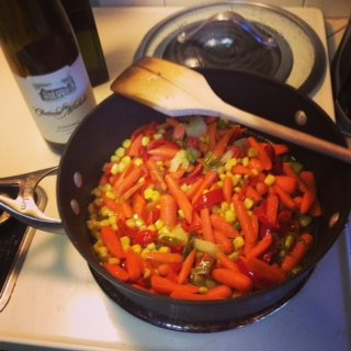 - Add the onion, bell pepper, corn, carrots, and garlic.