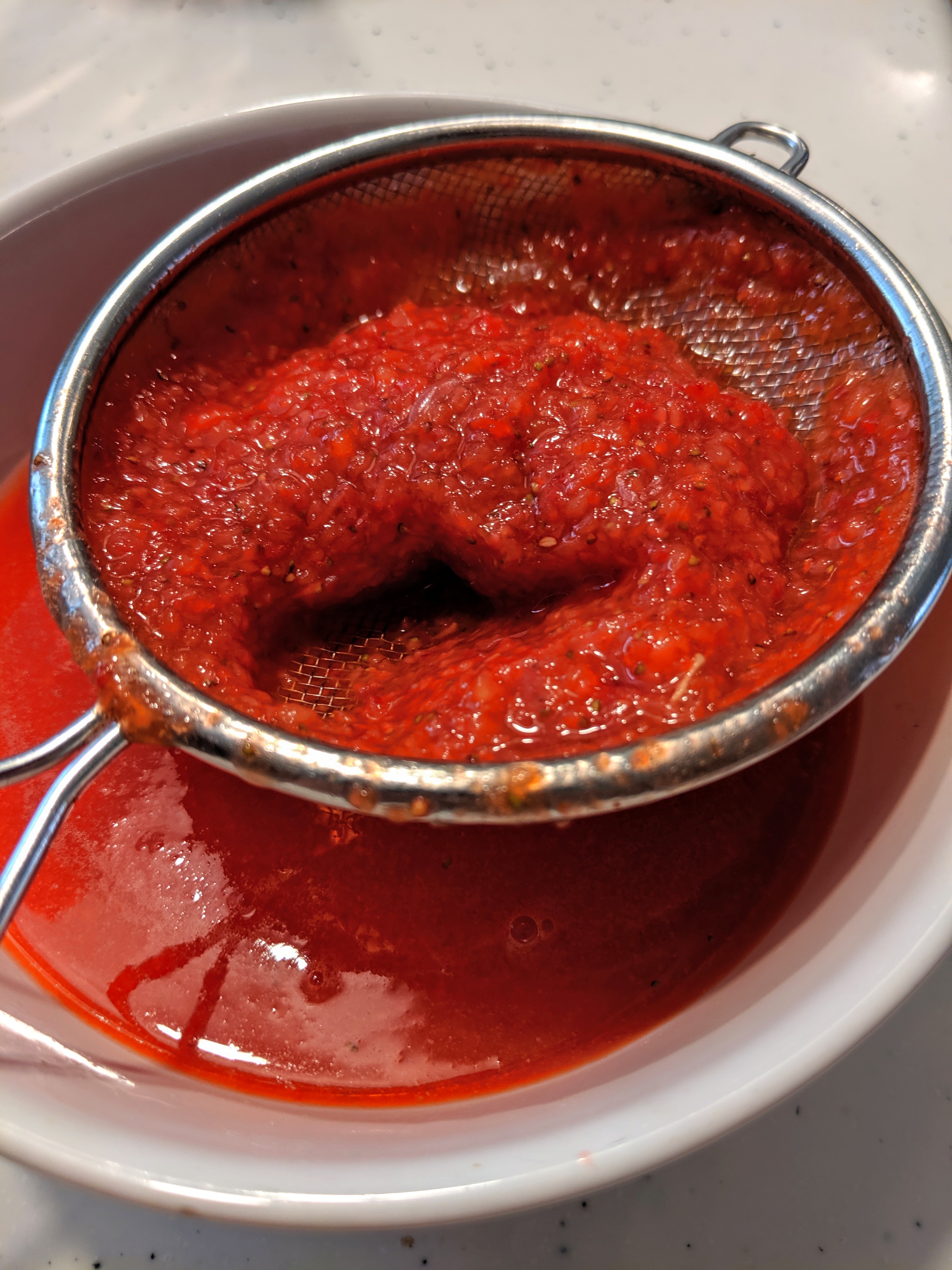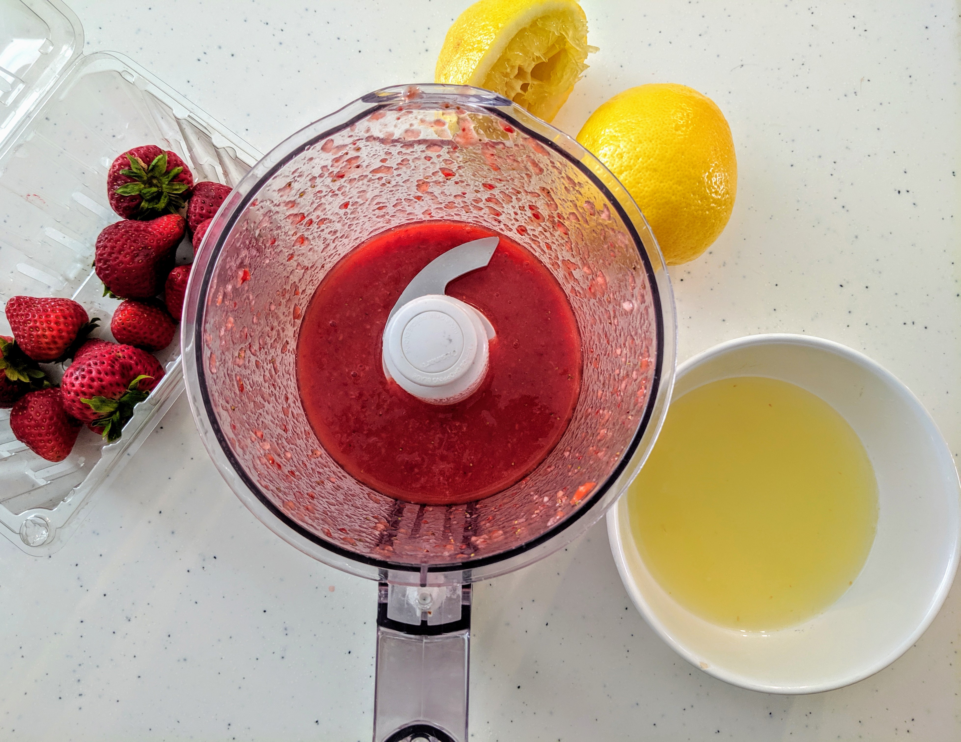 - Slice the strawberries in half and add the berries and 1/2 cup of water to a blender. Blend until smooth. Place mixture through a fine mesh strainer and strain out the seeds. Set the mixture aside.