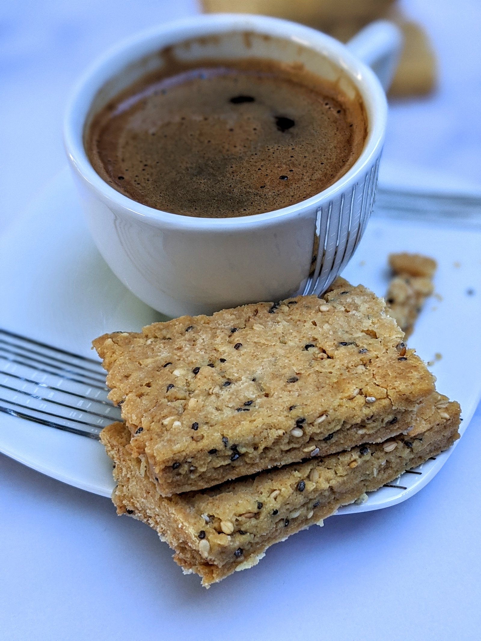 My paximadi is flavored with ouzo and vanilla. I love the kick of crunch from the sesame and chia seeds.
