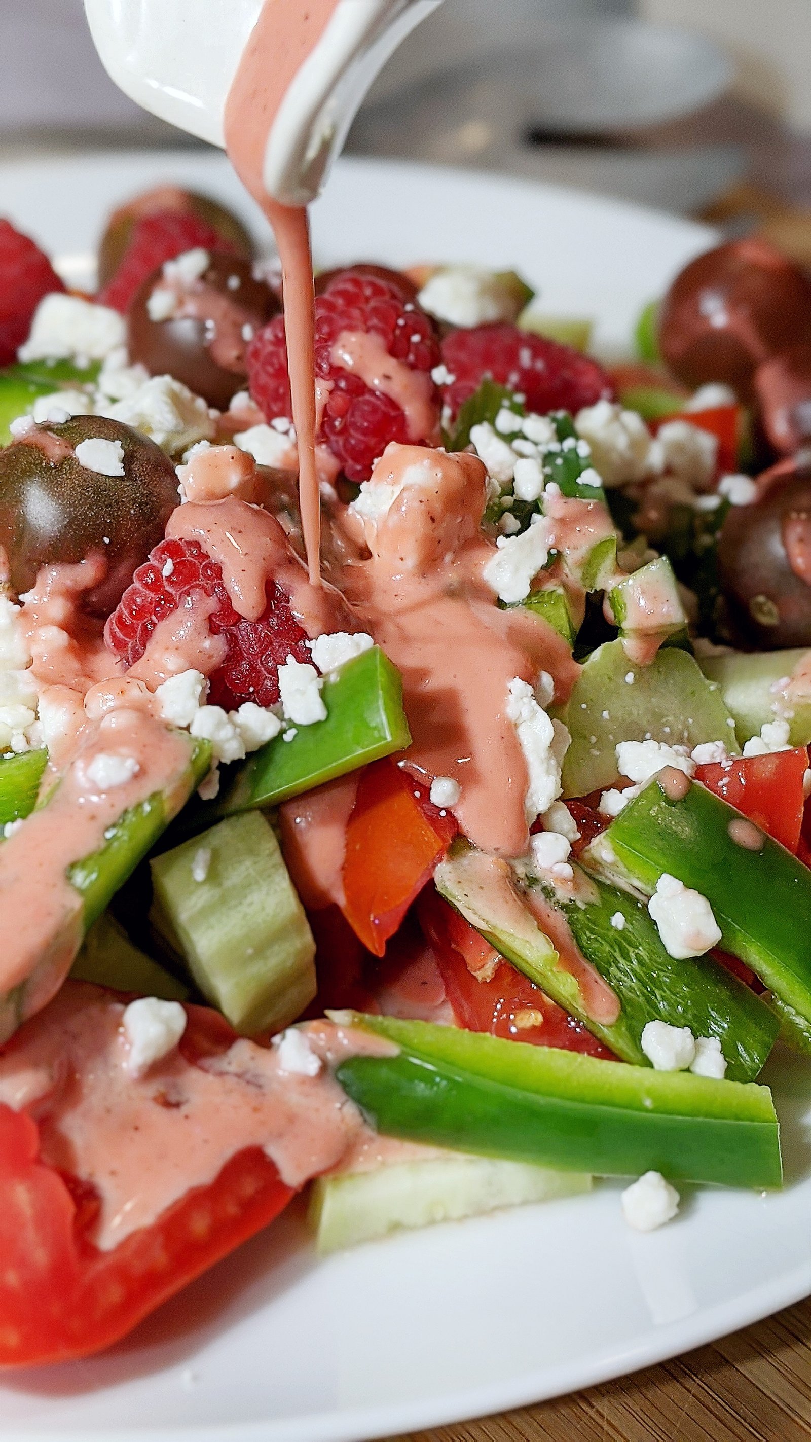 Last night I created this delicious healthy raspberry vinaigrette dressing! It is so simple to whip up in a matter of minutes, and such a tasty dressing! I paired this dressing with a simple summer salad since we still have hot weather in California.