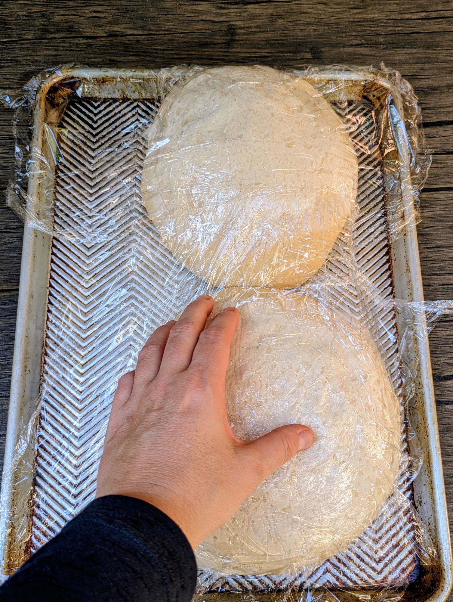 - Shape dough into a ball, and let it rest in a lightly greased bowl covered. I let mine rest for 2 hours, or until doubled in size. You should see bubbles and stretches in the dough.
