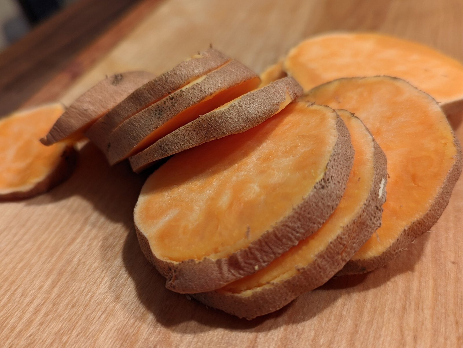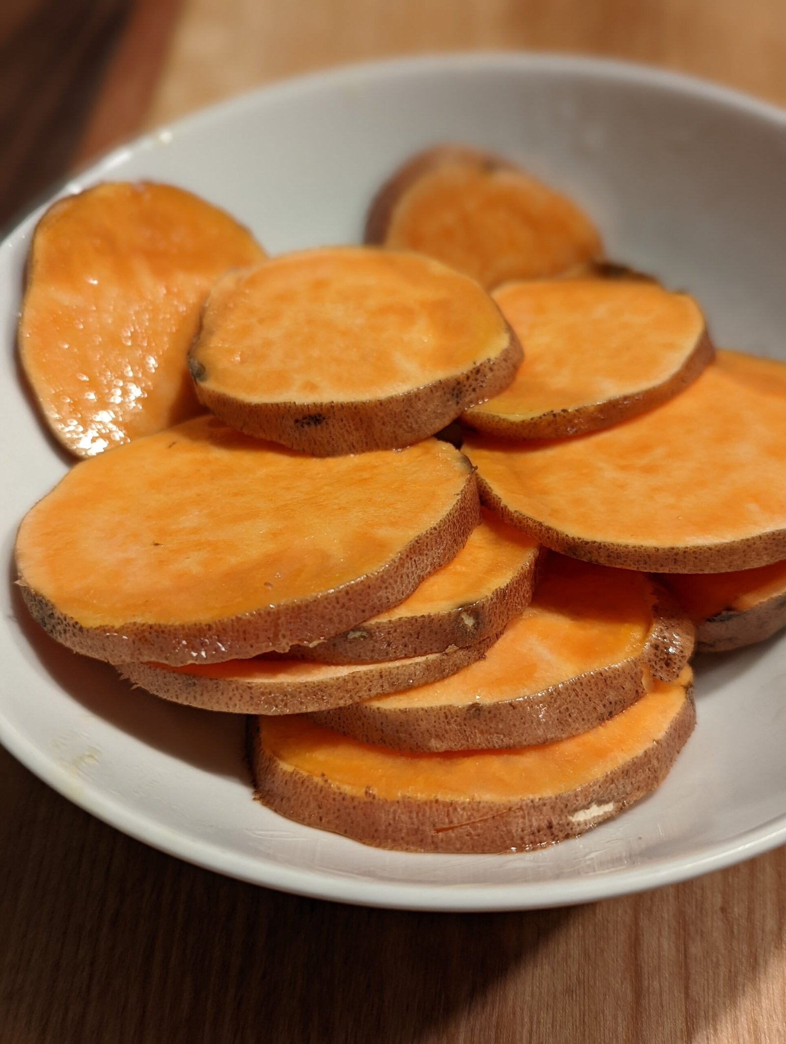 - Prepare the sweet potatoes. Wash the outside skin and leave that on. We don’t want to waste any of the potatoes. Slice the ends of each side of the potato, then cut rounds. I would go about 1/4 inch in thickness. My dad likes to cook the potatoes in the frying pan, but I think the texture is 100 percent better in the air fryer. So that is the route we are going now especially with the “crispy” texture we are going for.