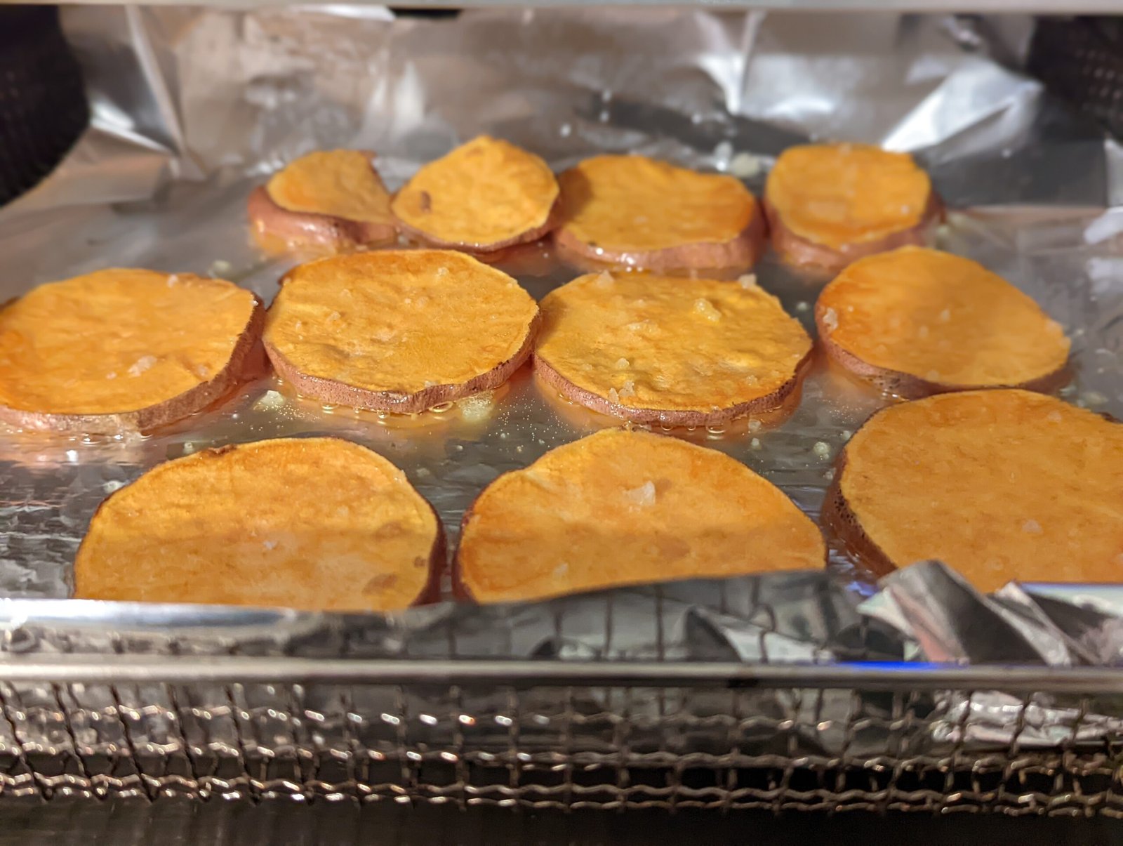 This is what the sweet potatoes look like in the air fryer. In my opinion, the texture is perfect in the air fryer.