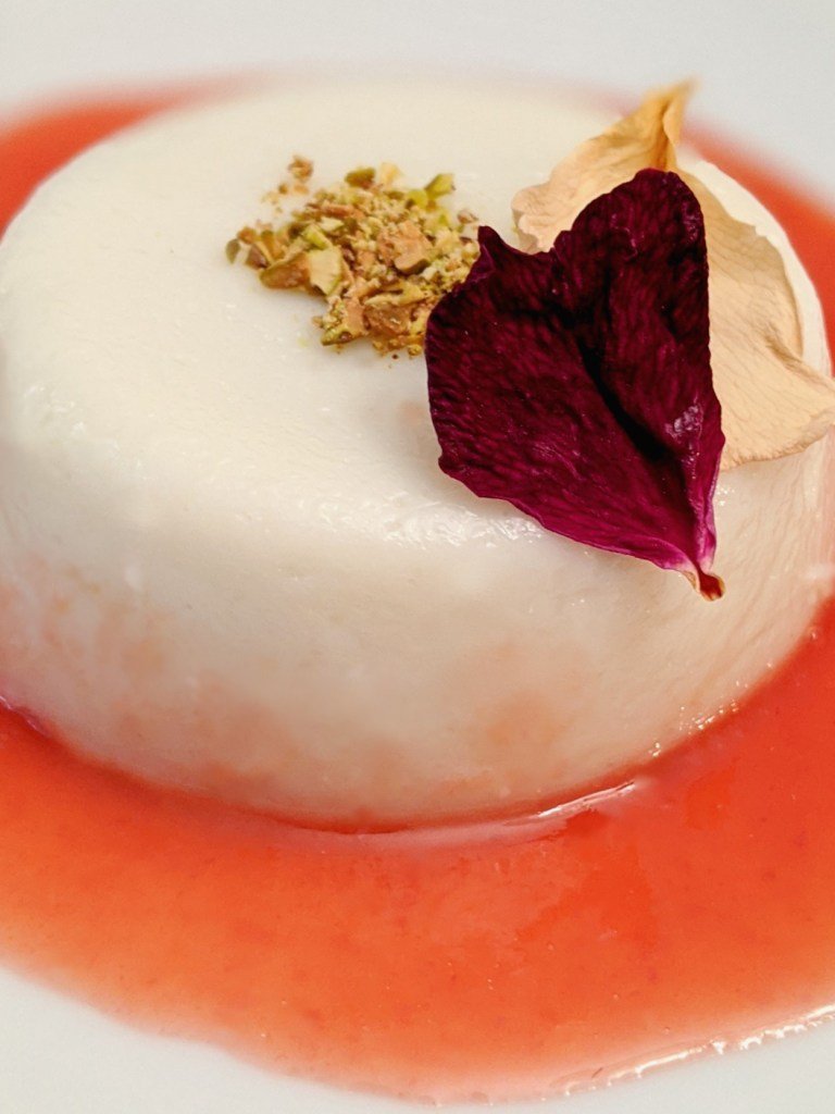 Serve with the mango strawberry sauce, and top with sprinkled pistachios. You can get fancy and add the dried rose petals.