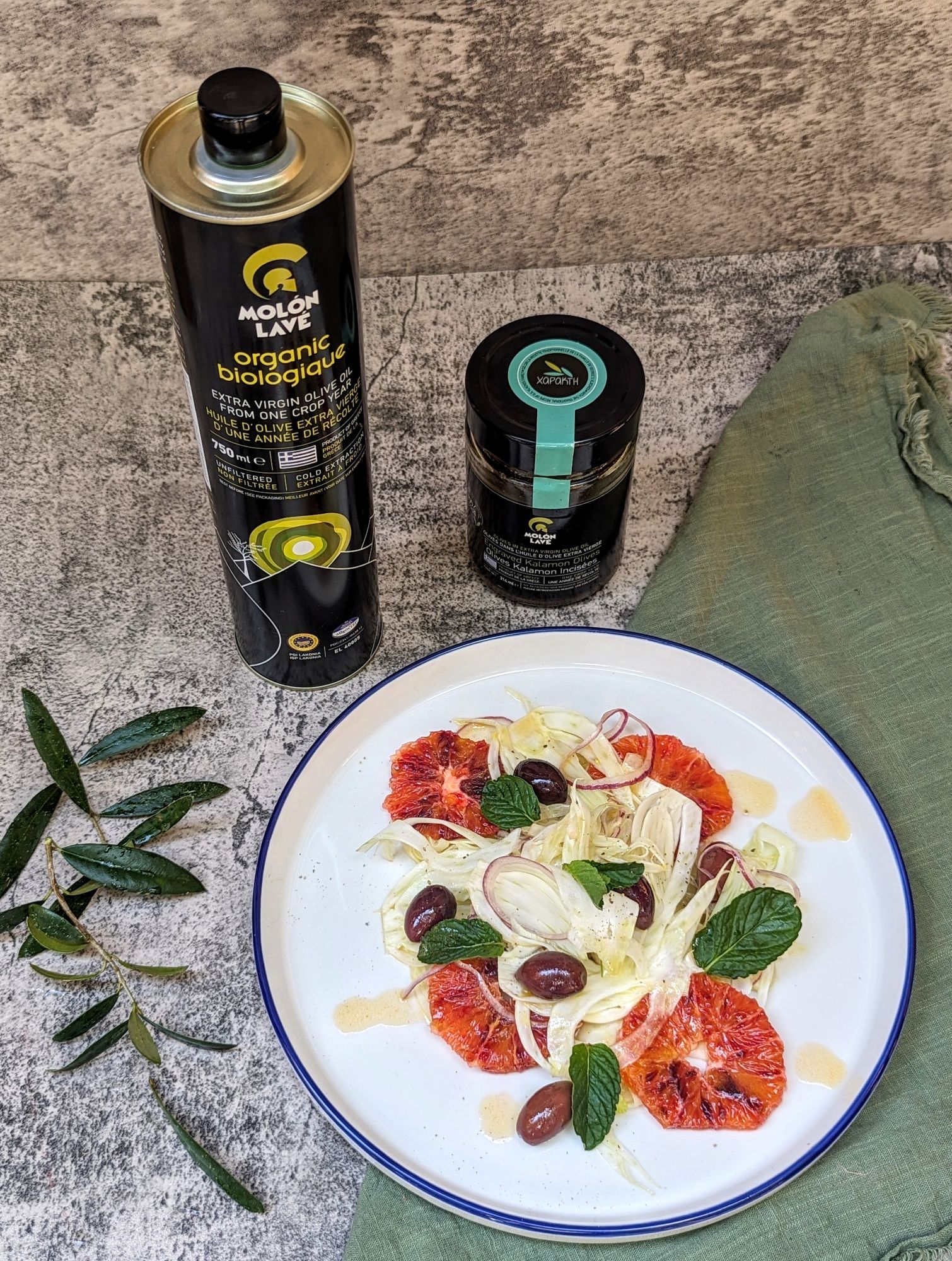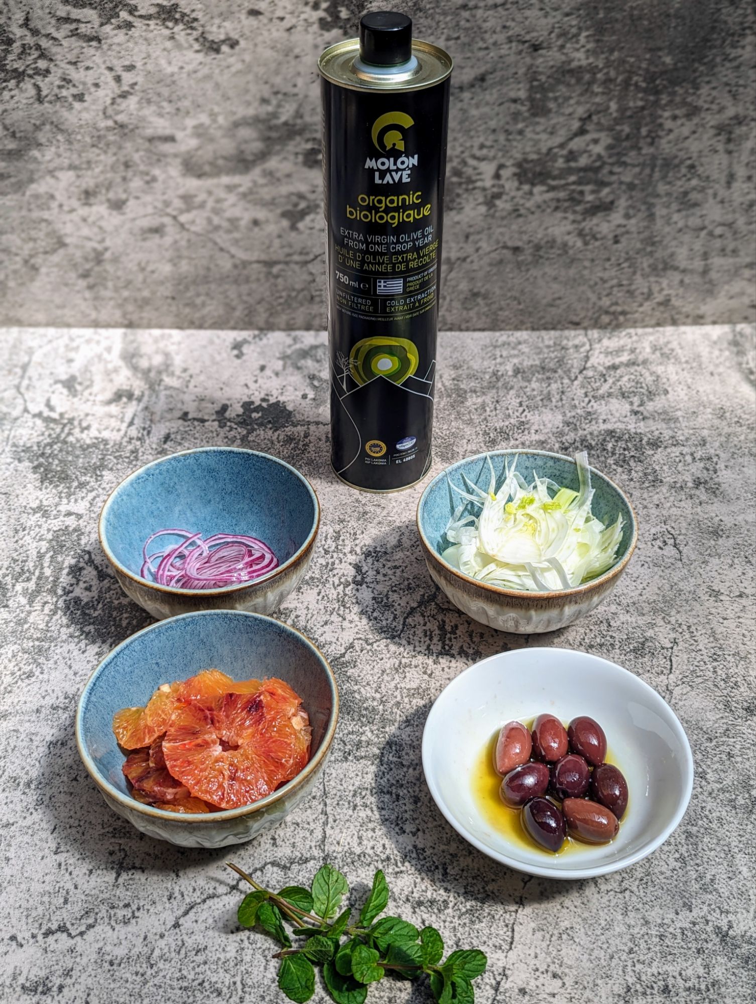 The main ingredients you need for this fine salad are fennel, blood orange, small red onion, fresh mint, honey, dijon mustard, Molon Lave olive oil, and kalamon olives.