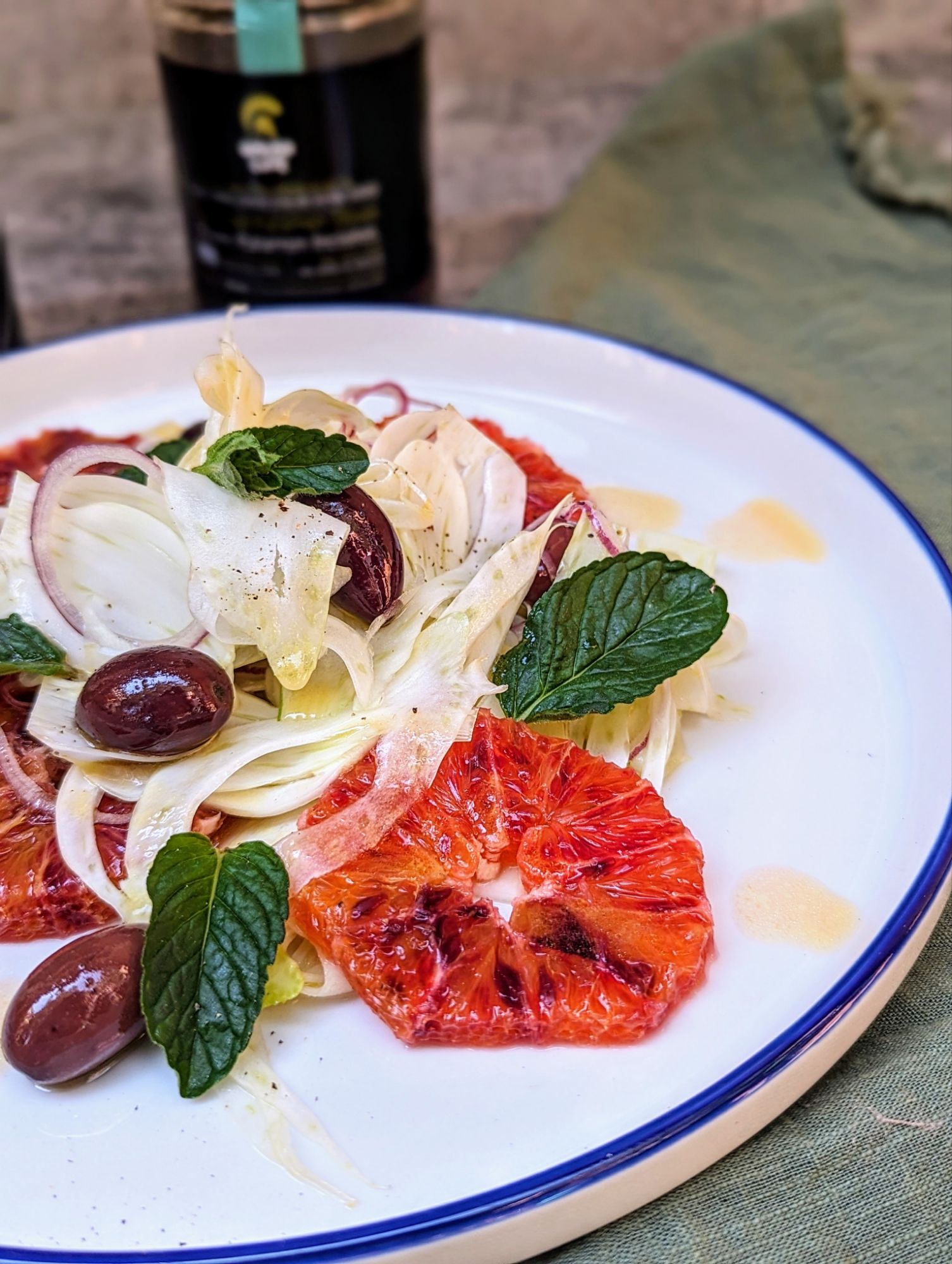 - Place half of the fennel onion mix on a plate almost flat, add 3 slices of orange, the rest of the fennel-onion mix on top lifting it. Decorate with the rest of the orange slices on top, 5-6 olives, and 4-5 mint leaves, crack some black pepper, and then serve with a tablespoon of dressing.