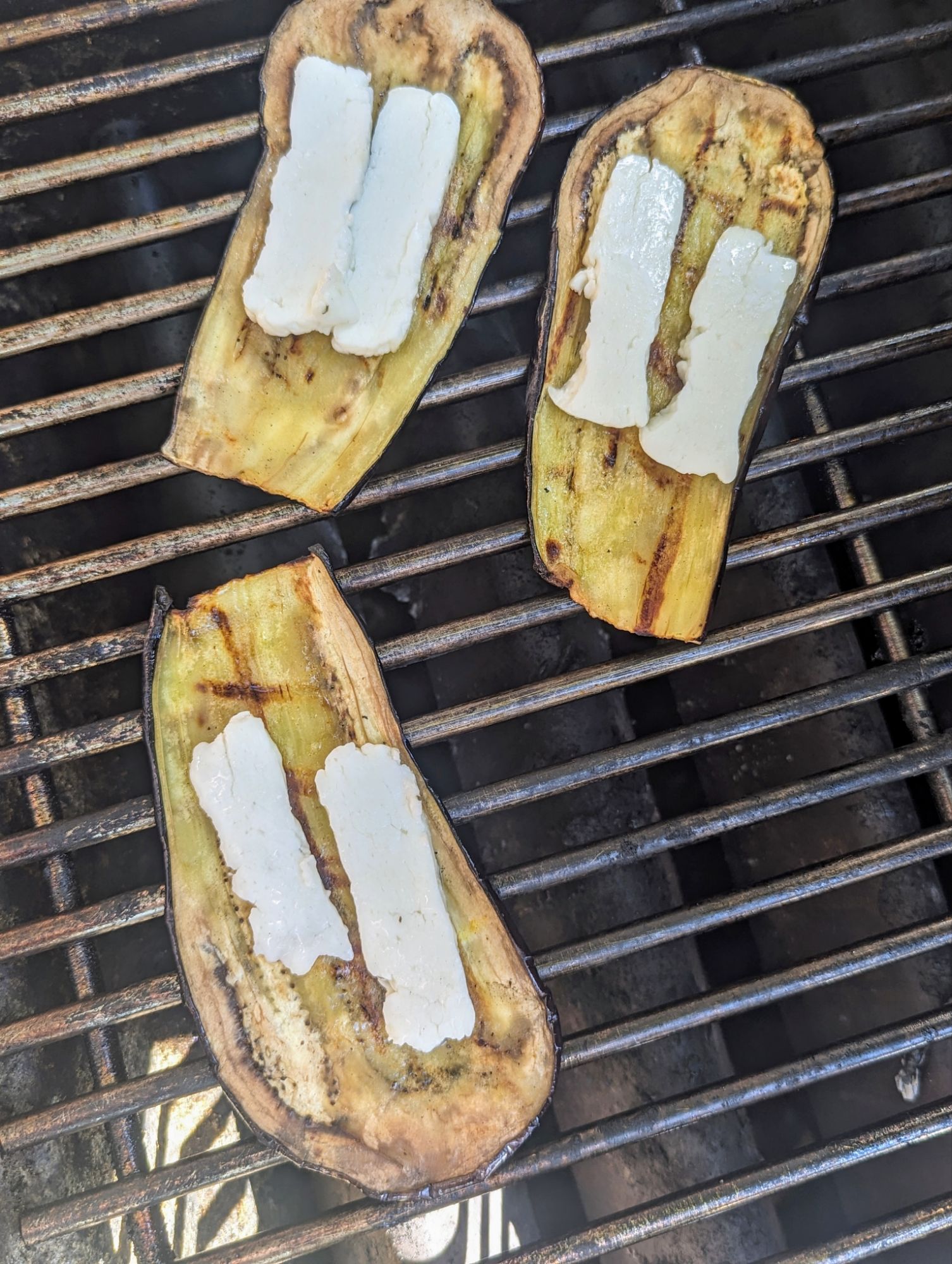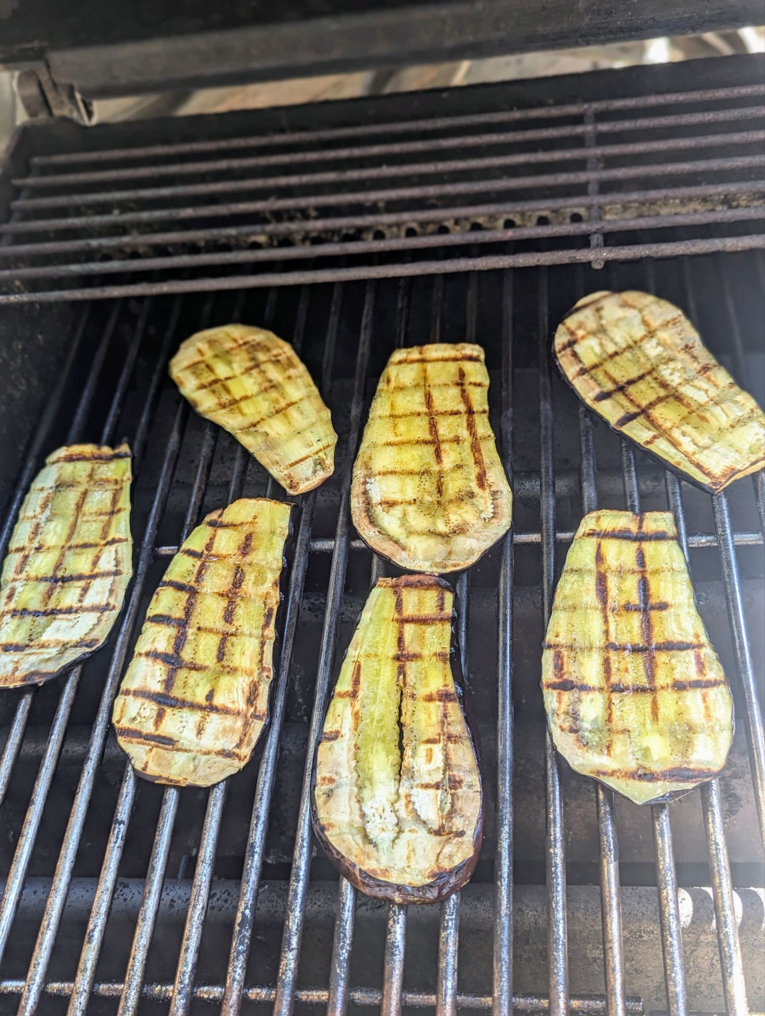 - Place a large pan over medium-high heat with a drizzle of olive oil—grill 2 eggplant slices in the pan at a time. Make sure to grill both sides of the eggplant until cooked. Place eggplant on a plate, then grill the rest of the slices. You can do this over the BBQ as this would be my preference.