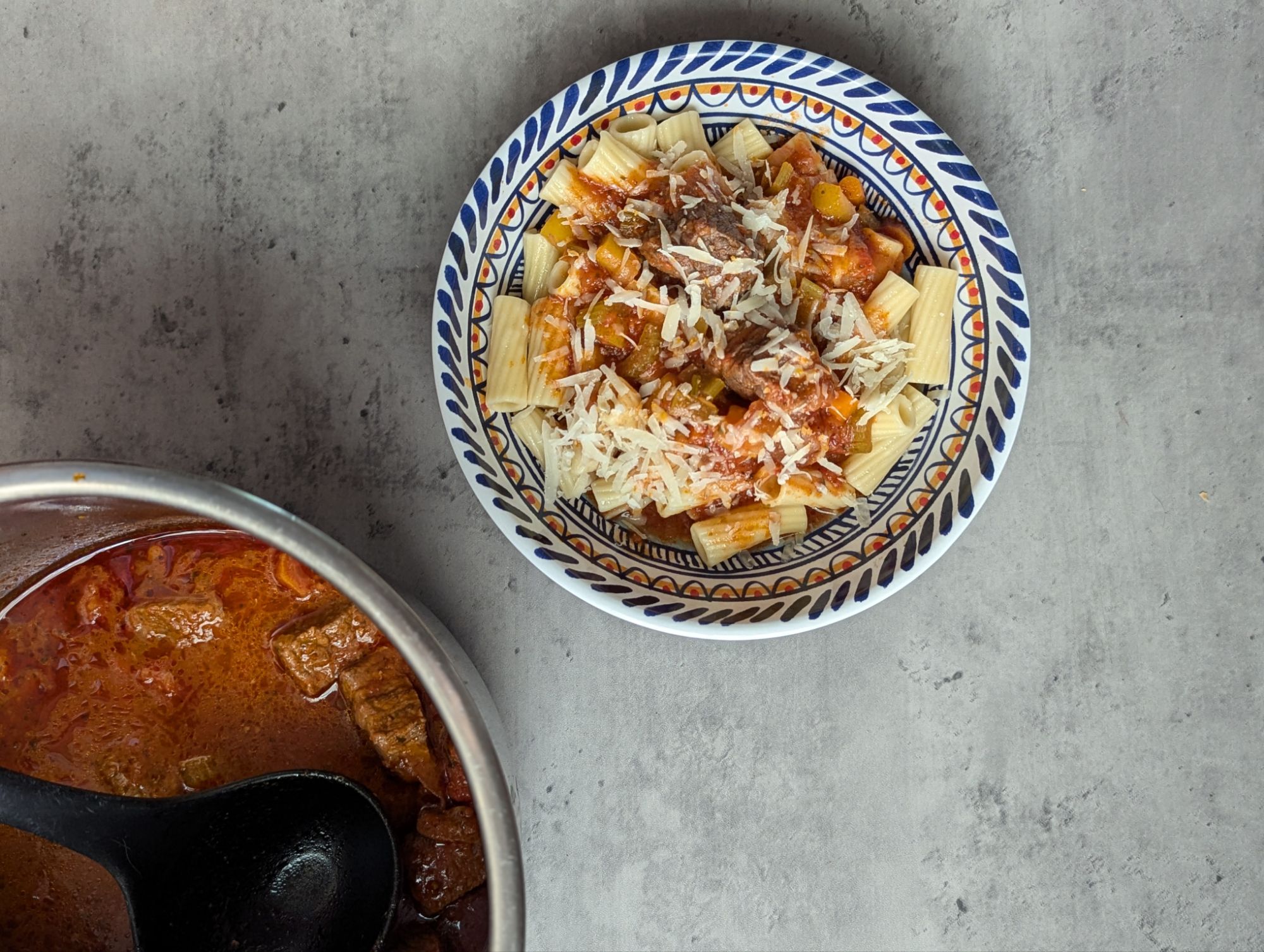 Beef Kokkinisto is traditionally served with pasta, rice, or perhaps mashed potatoes. Don’t forget to serve it with a helping of fresh kefalotyri or pecorino cheese over the top.