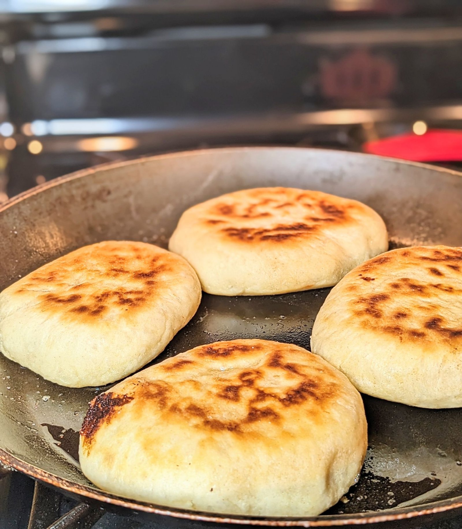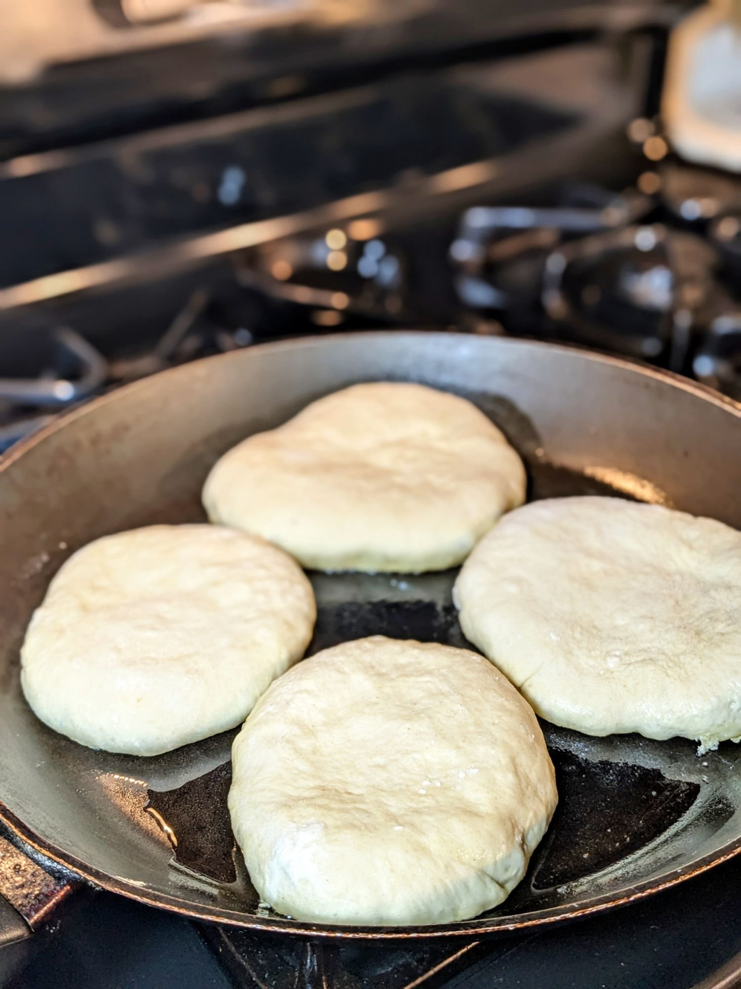 - Heat a large pan over medium heat with a drizzle of olive oil. Cook each pita for 3-4 minutes per side or until golden and puffed. Make sure the inside dough is cooked thoroughly, and if not continue cooking.