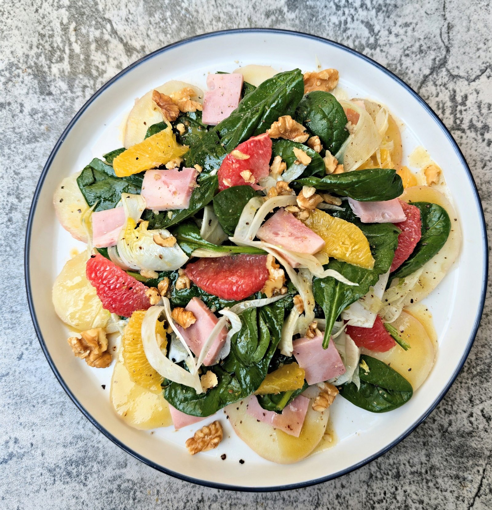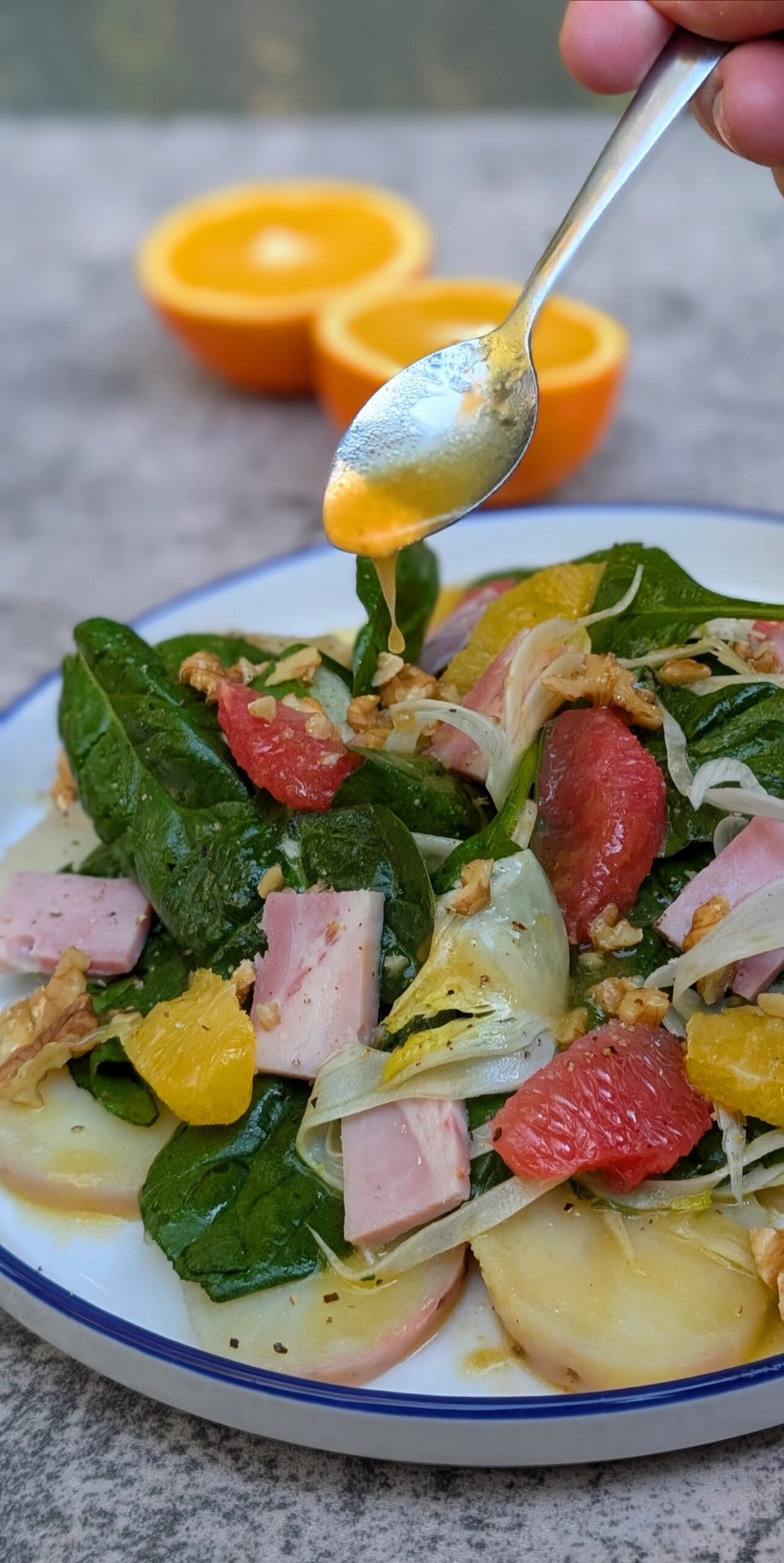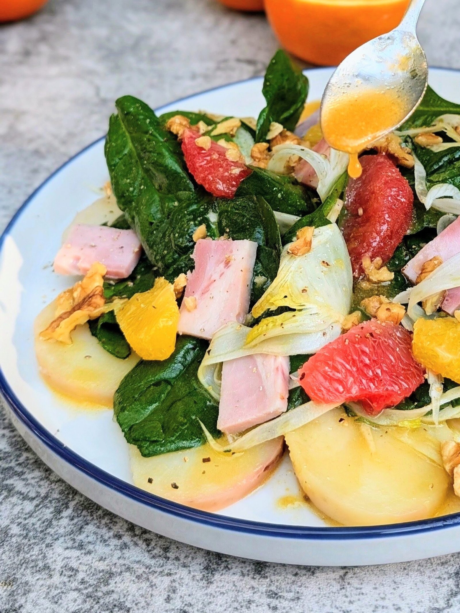 - Add the beautiful orange segments over the salad, and then add the cubed ham on top. Sprinkle with toasted walnuts & add more pepper if needed. You can drizzle more dressing if you have any extra, for added flavor.