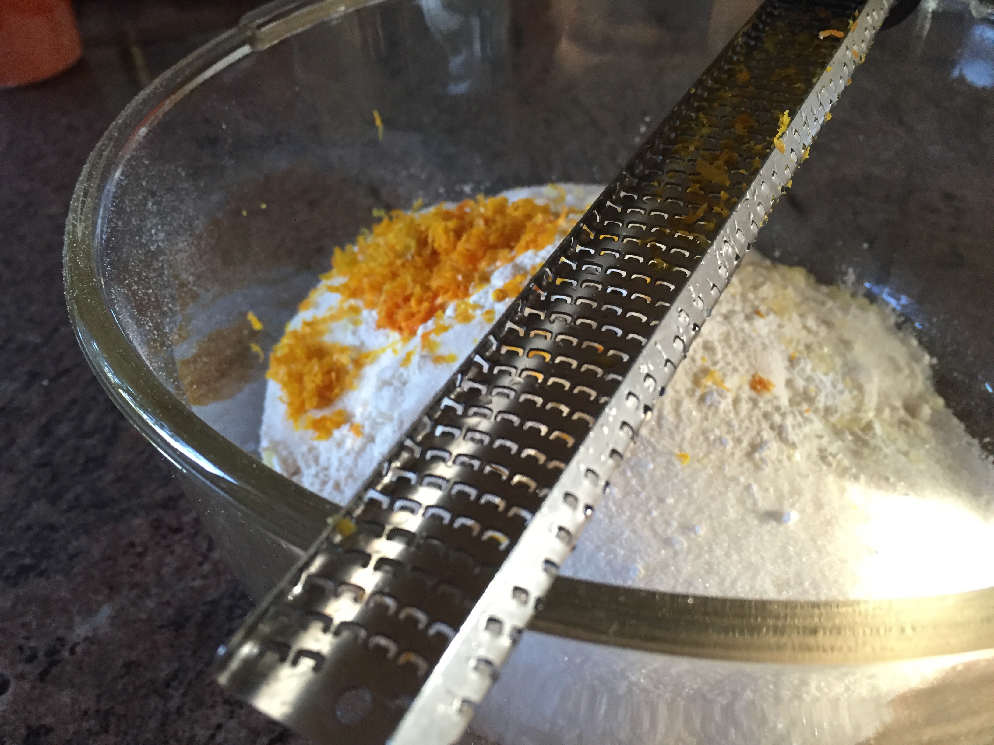 - In a large bowl combine the dry ingredients. (Flour, sugar, salt, baking powder, mastiha, cardamom, and orange zest.)