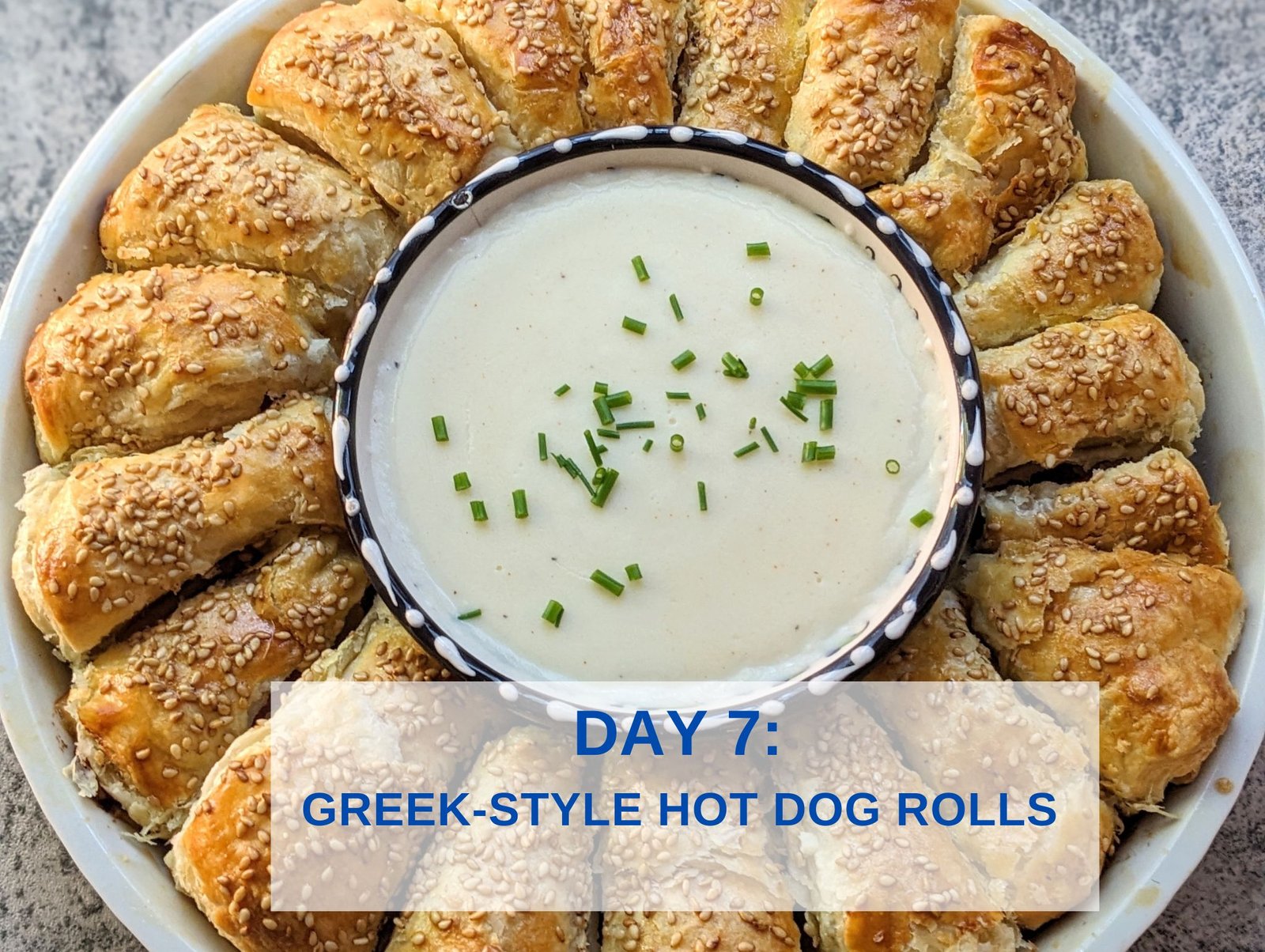 Hello everyone! Today, I’m sharing a super fun recipe that’s perfect for cooking with the little chefs in your life. Get your kiddos ready for an exciting appetizer for day 7—Greek-style hot dog rolls! These are delicious and inspired by the Greek loukanikopitakia. If you haven’t been to Greece yet…
