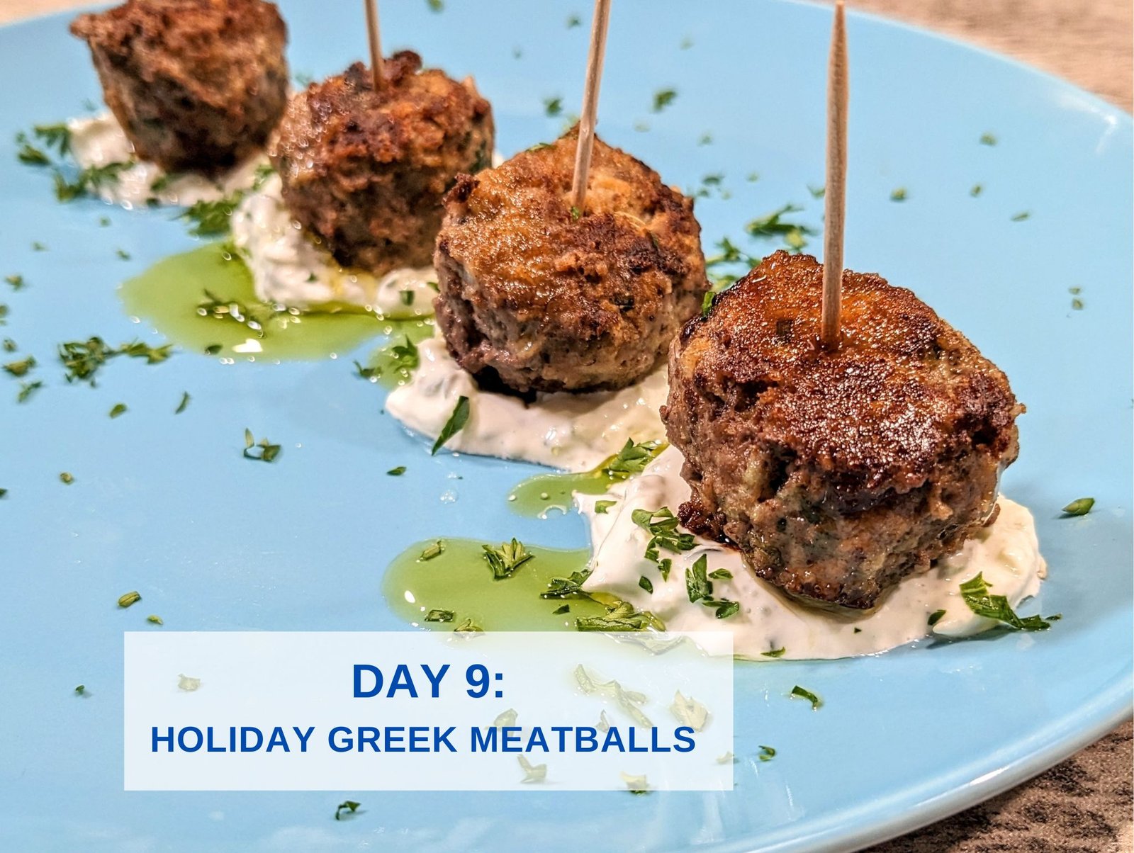 Gluten-Free Holiday Greek Meatballs (Keftedes) Day #9 of the Twelve Days of Christmas Meze! How about tasty Greek meatballs, but a gluten-free friendly version? These are so aromatic and tasty!   These Greek keftedes are the perfect addition to your holiday table! Pair them with a festive red-and-green dipping platter…